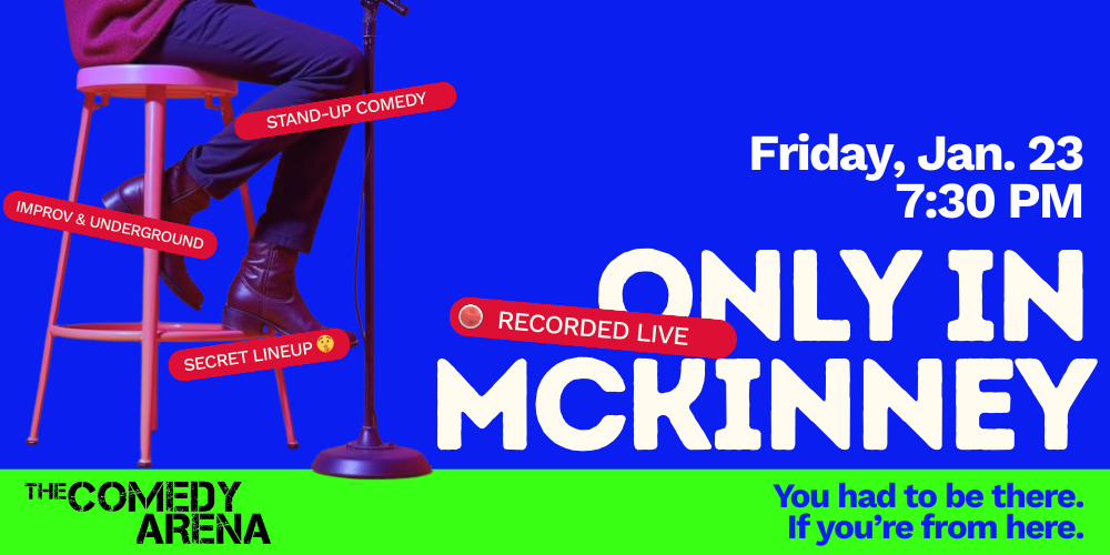 This is the show everyone’s talking about after it happens. Only in McKinney: Recorded Live features a secret lineup of stand-up assassins, a quick-hit improv reset, and underground comedy you usually have to hunt for. It’s local, it’s electric, and it’s being recorded live. You’ll either be in the audience… or watching the clips wishing you were. McKinney knows. You should too.PT1HRecommended for Mature Audiences2026-01-23Only in McKinney: Recorded Live"Only in McKinney: Recorded Live"